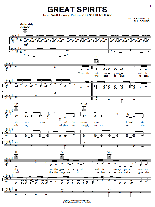 Download or print Phil Collins Great Spirits sheet music, chords and digital score arranged for Piano, Vocal & Guitar Chords (Right-Hand Melody). This Children score includes 5 page(s).