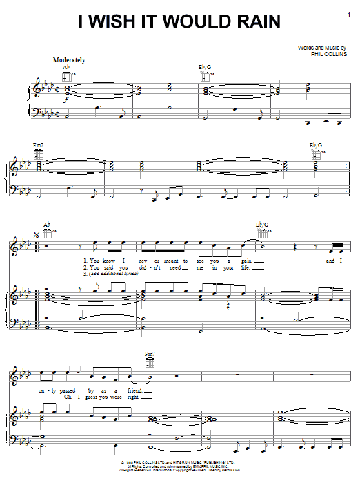 Download or print Phil Collins I Wish It Would Rain sheet music, chords and digital score arranged for Piano, Vocal & Guitar Chords (Right-Hand Melody). This Pop score includes 5 page(s).