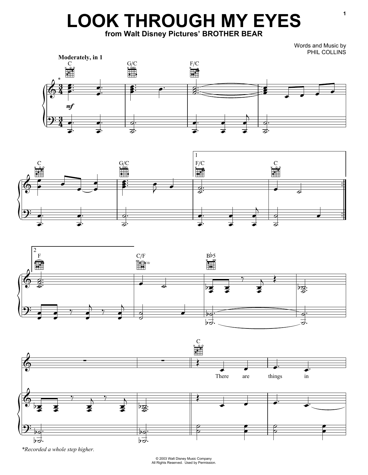 Download or print Phil Collins Look Through My Eyes sheet music, chords and digital score arranged for Big Note Piano. This Children score includes 9 page(s).
