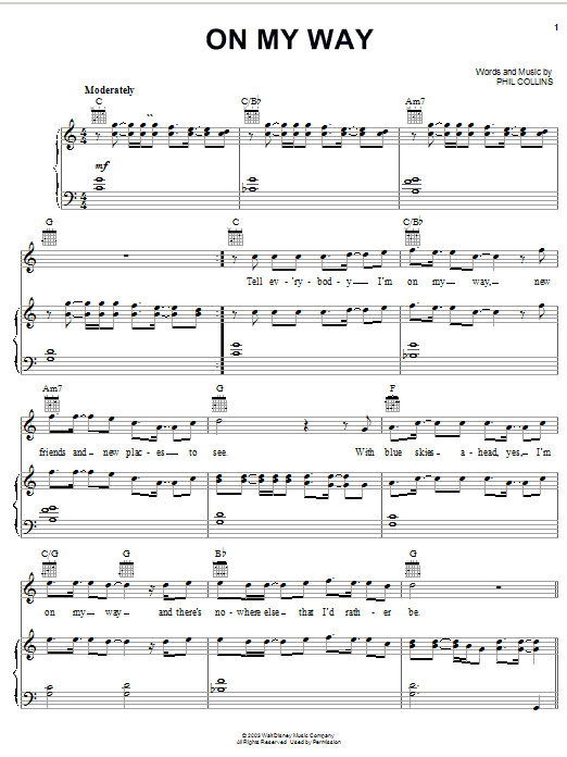 Download or print Phil Collins On My Way sheet music, chords and digital score arranged for Piano, Vocal & Guitar Chords (Right-Hand Melody). This Children score includes 6 page(s).