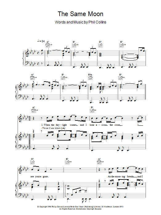 Download or print Phil Collins The Same Moon sheet music, chords and digital score arranged for Piano, Vocal & Guitar Chords. This Pop score includes 6 page(s).
