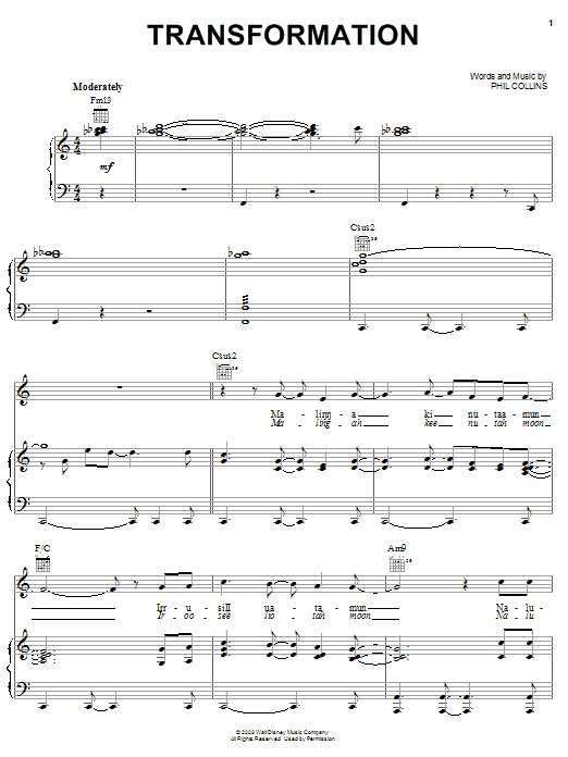 Download or print Phil Collins Transformation sheet music, chords and digital score arranged for Piano, Vocal & Guitar Chords (Right-Hand Melody). This Children score includes 5 page(s).