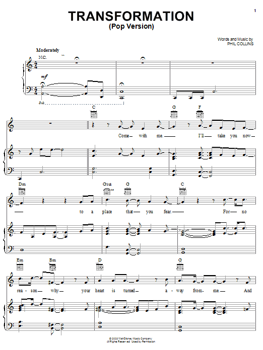 Download or print Phil Collins Transformation (Pop Version) sheet music, chords and digital score arranged for Easy Piano. This Children score includes 5 page(s).