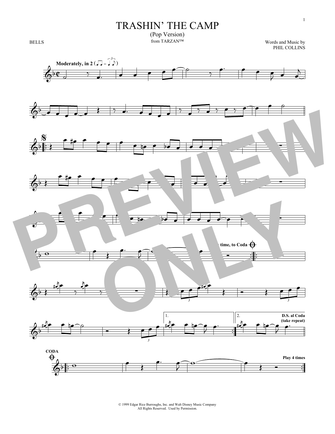 Download or print Phil Collins Trashin' The Camp (from Tarzan) sheet music, chords and digital score arranged for Bells Solo. This Disney score includes 1 page(s).