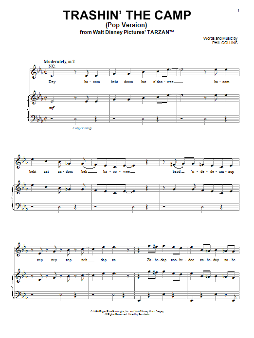 Download or print Phil Collins Trashin' The Camp (Pop Version) (from Tarzan) sheet music, chords and digital score arranged for Lead Sheet / Fake Book. This Children score includes 2 page(s).