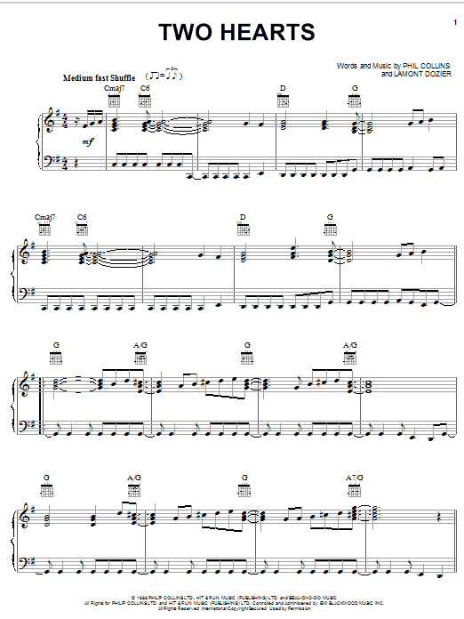 Download or print Phil Collins Two Hearts sheet music, chords and digital score arranged for Super Easy Piano. This Pop score includes 2 page(s).