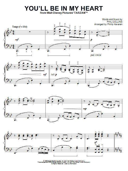 Download or print Phil Collins You'll Be In My Heart [Classical version] (from Tarzan) (arr. Phillip Keveren) sheet music, chords and digital score arranged for Piano Solo. This Children score includes 5 page(s).