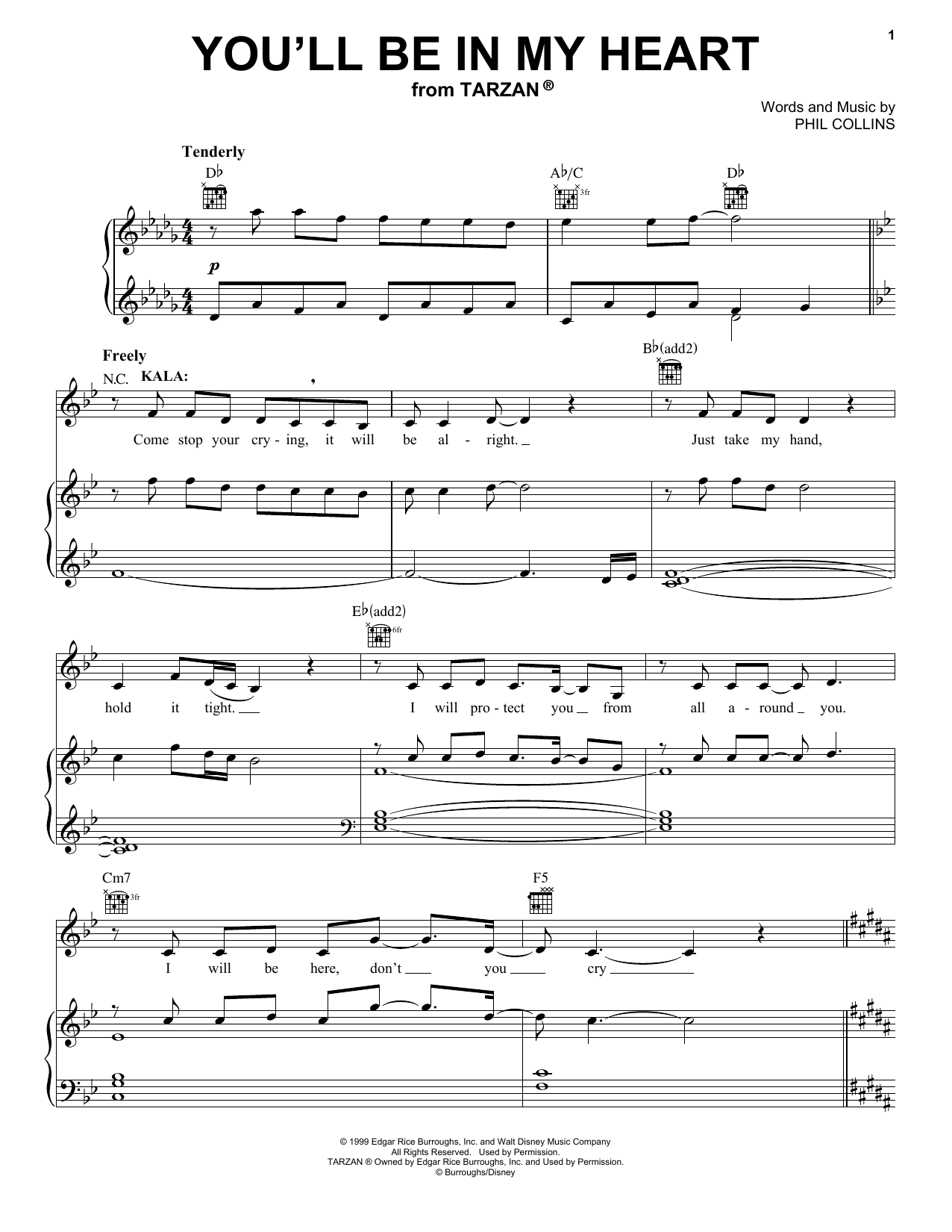 Download or print Phil Collins You'll Be In My Heart (from Tarzan: The Broadway Musical) sheet music, chords and digital score arranged for Piano & Vocal. This Children score includes 5 page(s).