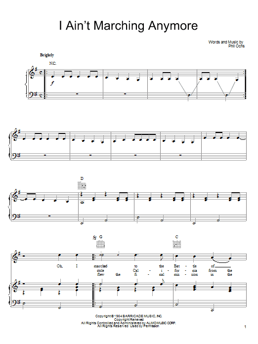 Download or print Phil Ochs I Ain't Marching Anymore sheet music, chords and digital score arranged for Piano, Vocal & Guitar Chords (Right-Hand Melody). This Folk score includes 5 page(s).