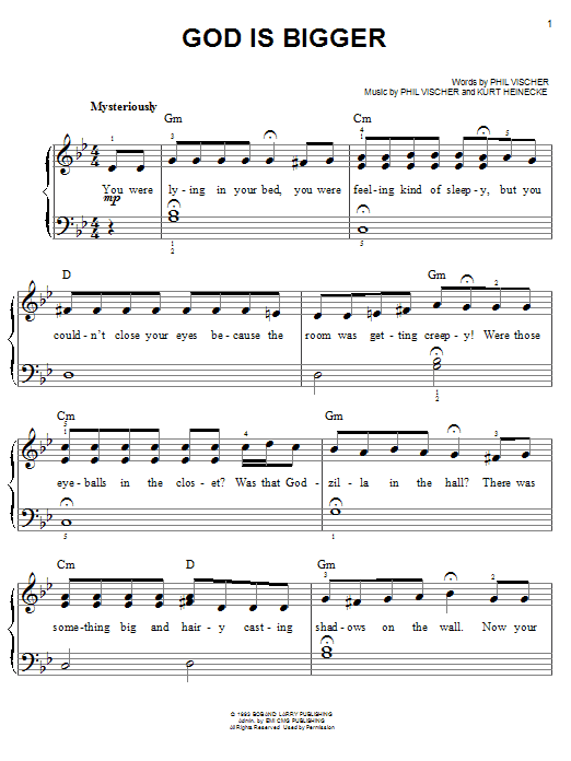 Download or print Phil Vischer God Is Bigger sheet music, chords and digital score arranged for Easy Piano. This Children score includes 4 page(s).