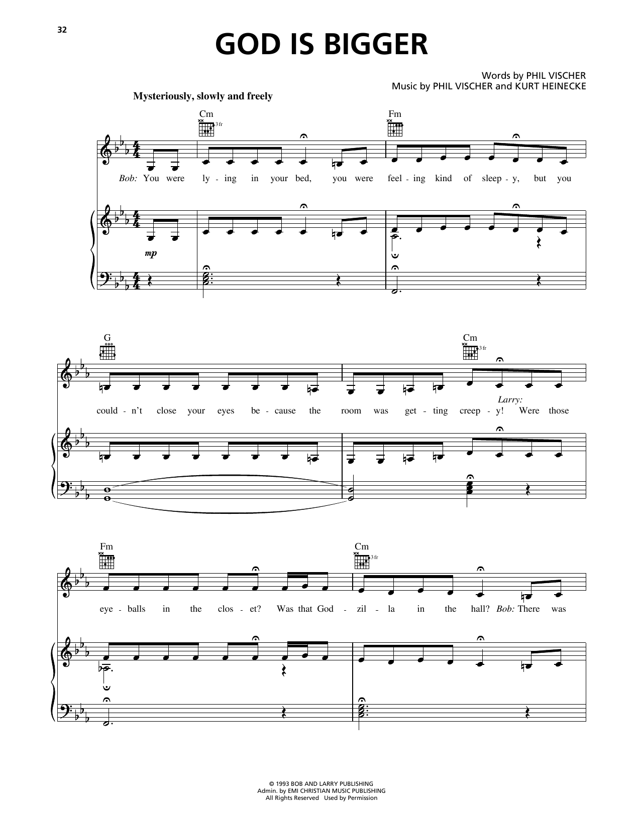 Download or print Phil Vischer God Is Bigger (from VeggieTales) sheet music, chords and digital score arranged for Piano, Vocal & Guitar Chords (Right-Hand Melody). This Sacred score includes 7 page(s).