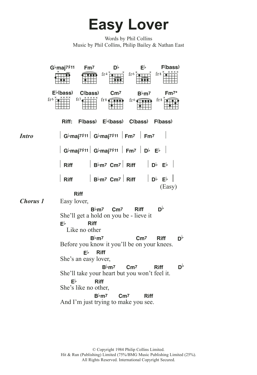 Download or print Phil Collins Easy Lover sheet music, chords and digital score arranged for Guitar Chords/Lyrics. This Pop score includes 4 page(s).