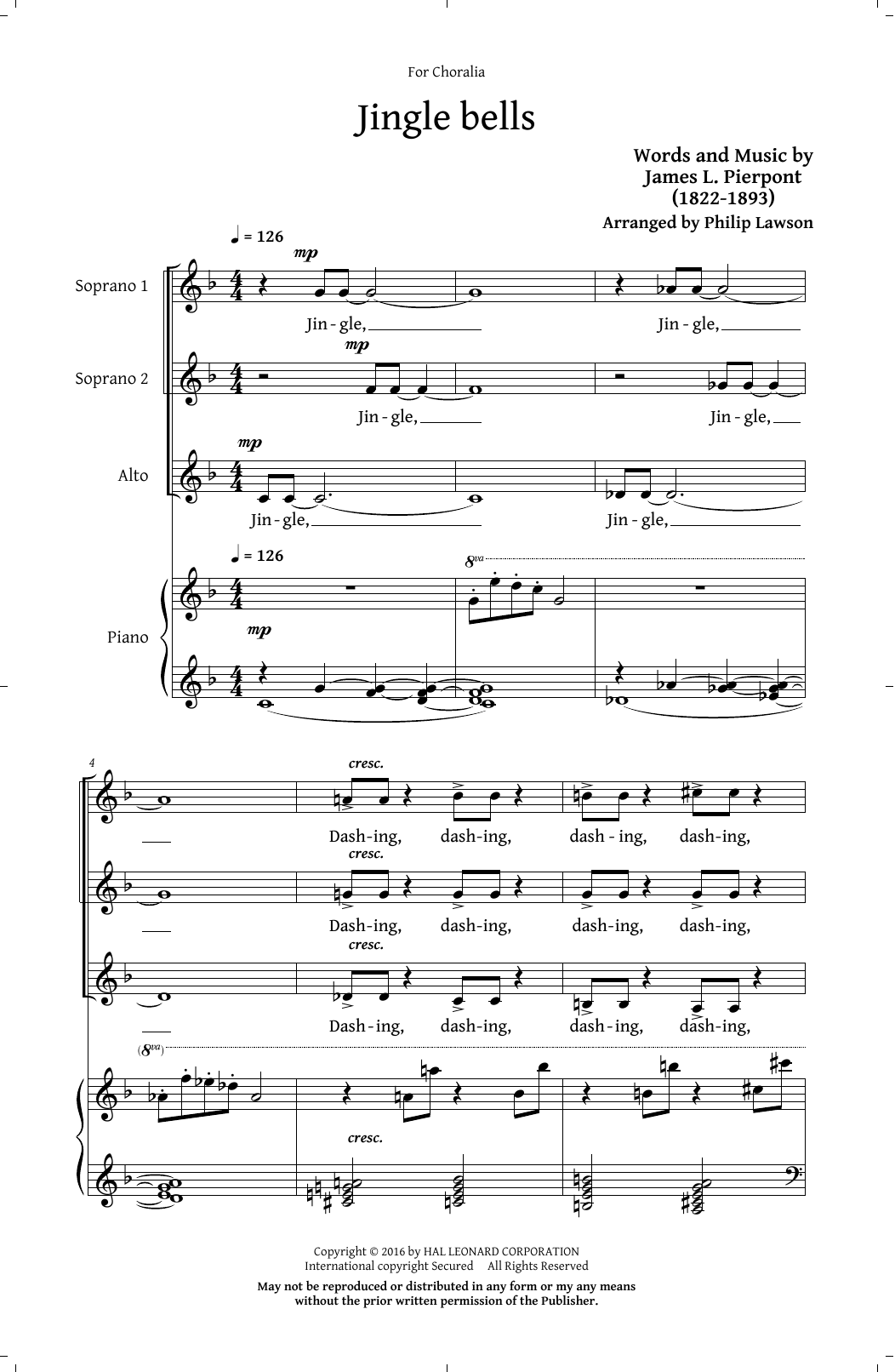 Download or print Philip Lawson Jingle Bells sheet music, chords and digital score arranged for SSA Choir. This Christmas score includes 15 page(s).