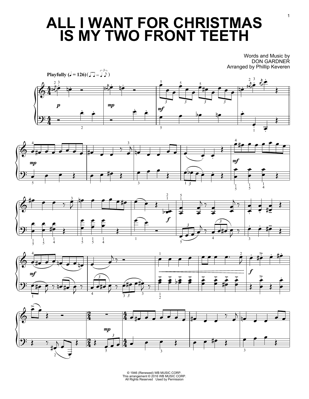 Download or print Don Gardner All I Want For Christmas Is My Two Front Teeth (arr. Phillip Keveren) sheet music, chords and digital score arranged for Piano Solo. This Children score includes 2 page(s).