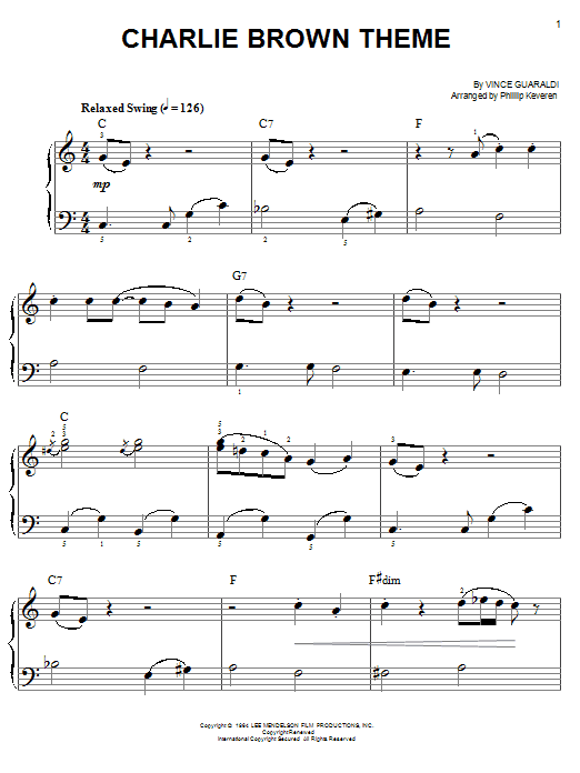 Download or print Vince Guaraldi Charlie Brown Theme (arr. Phillip Keveren) sheet music, chords and digital score arranged for Piano Solo. This Children score includes 3 page(s).