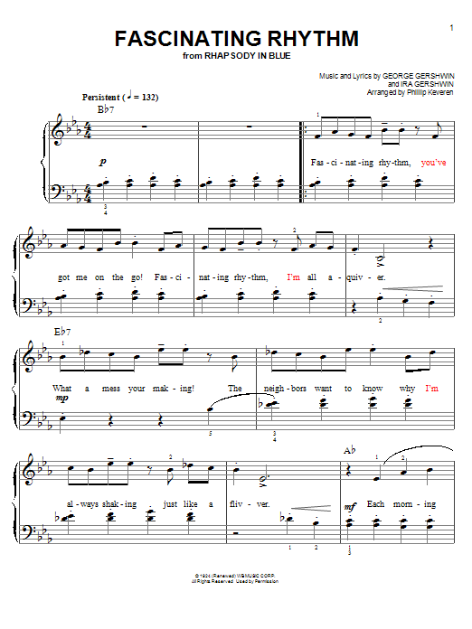 Download or print George Gershwin Fascinating Rhythm (arr. Phillip Keveren) sheet music, chords and digital score arranged for Easy Piano. This Jazz score includes 3 page(s).
