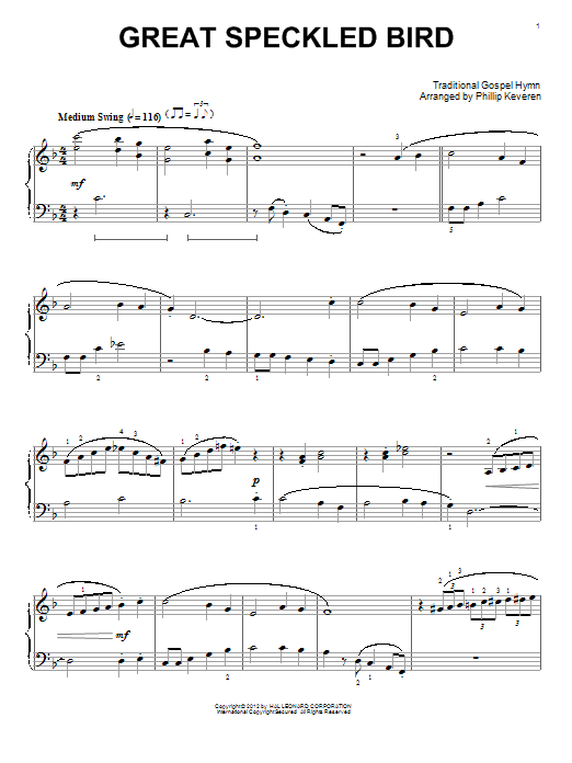 Download or print Traditional Gospel Hymn Great Speckled Bird (arr. Phillip Keveren) sheet music, chords and digital score arranged for Piano Solo. This Gospel score includes 3 page(s).