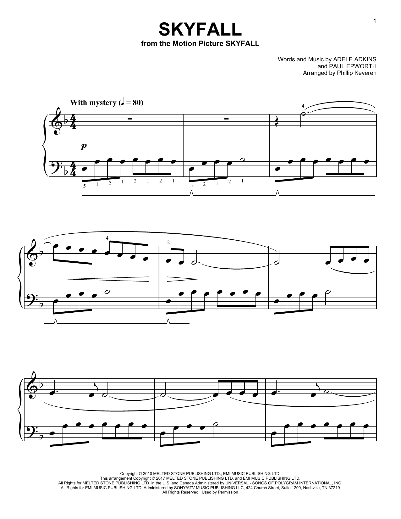 Download or print Adele Skyfall [Classical version] (arr. Phillip Keveren) sheet music, chords and digital score arranged for Easy Piano. This Pop score includes 3 page(s).