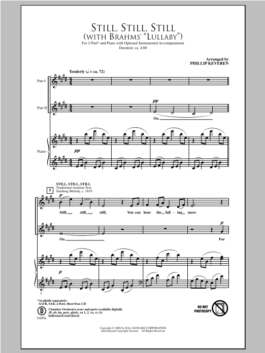 Download or print Phillip Keveren Still, Still, Still (with Brahm's Lullaby) sheet music, chords and digital score arranged for SATB Choir. This Carol score includes 7 page(s).