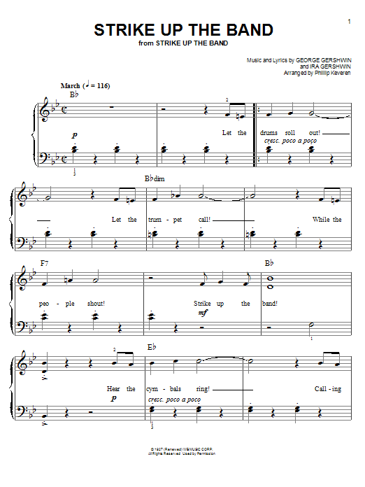 Download or print George Gershwin Strike Up The Band (arr. Phillip Keveren) sheet music, chords and digital score arranged for Easy Piano. This Standards score includes 3 page(s).