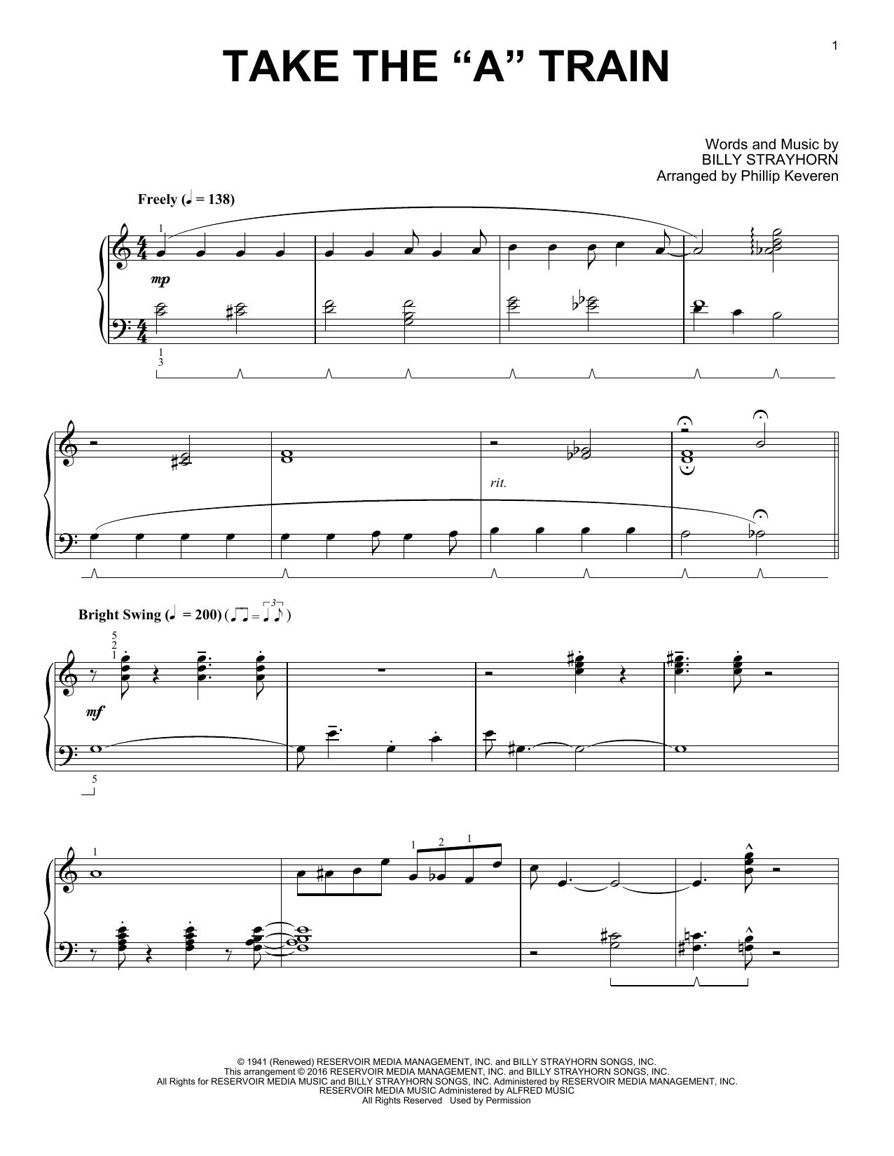 Download or print Billy Strayhorn Take The "A" Train (arr. Phillip Keveren) sheet music, chords and digital score arranged for Piano Solo. This Blues score includes 3 page(s).