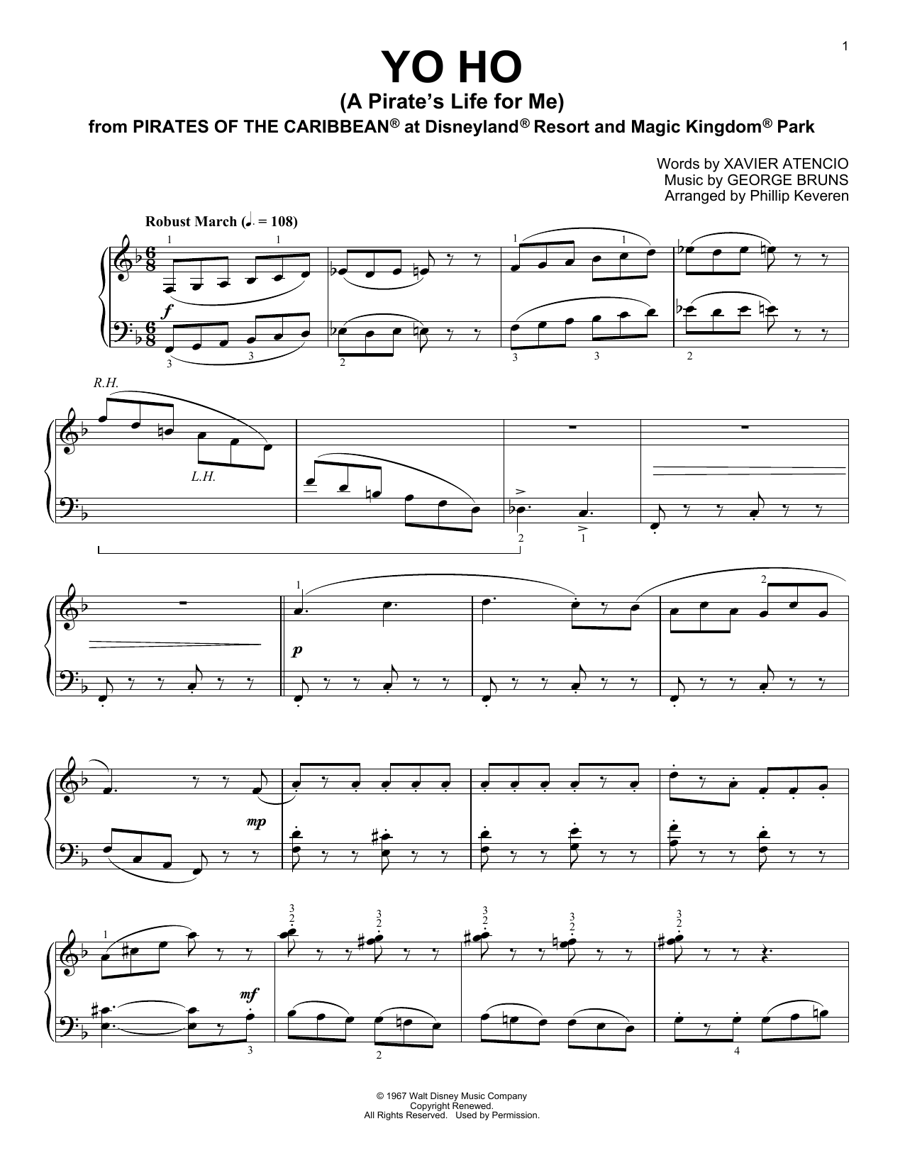 Download or print George Bruns Yo Ho (A Pirate's Life For Me) [Ragtime version] (arr. Phillip Keveren) sheet music, chords and digital score arranged for Piano Solo. This Children score includes 4 page(s).