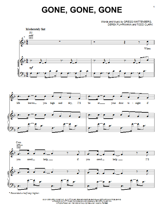 Download or print Phillip Phillips Gone, Gone, Gone sheet music, chords and digital score arranged for Piano, Vocal & Guitar Chords (Right-Hand Melody). This Pop score includes 9 page(s).