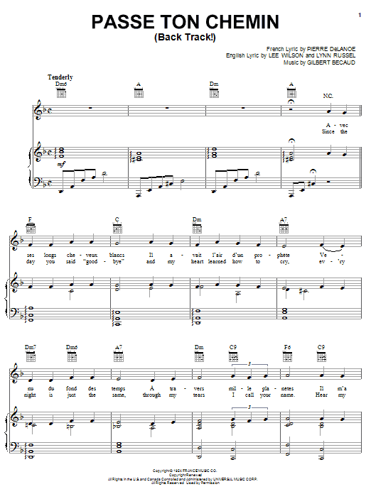 Download or print Pierre Delanoe Passe Ton Chemin (Back Track!) sheet music, chords and digital score arranged for Piano, Vocal & Guitar Chords (Right-Hand Melody). This French score includes 6 page(s).