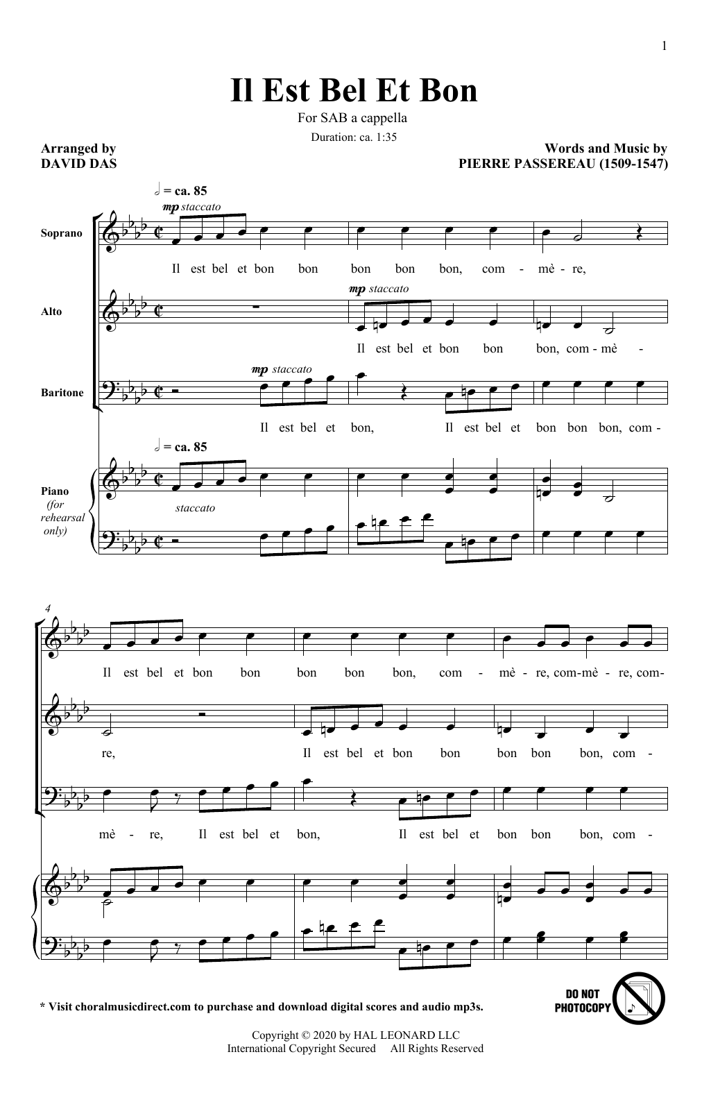 Download or print Pierre Passereau Il Est Bel Et Bon (arr. David Das) sheet music, chords and digital score arranged for SAB Choir. This Christmas score includes 10 page(s).