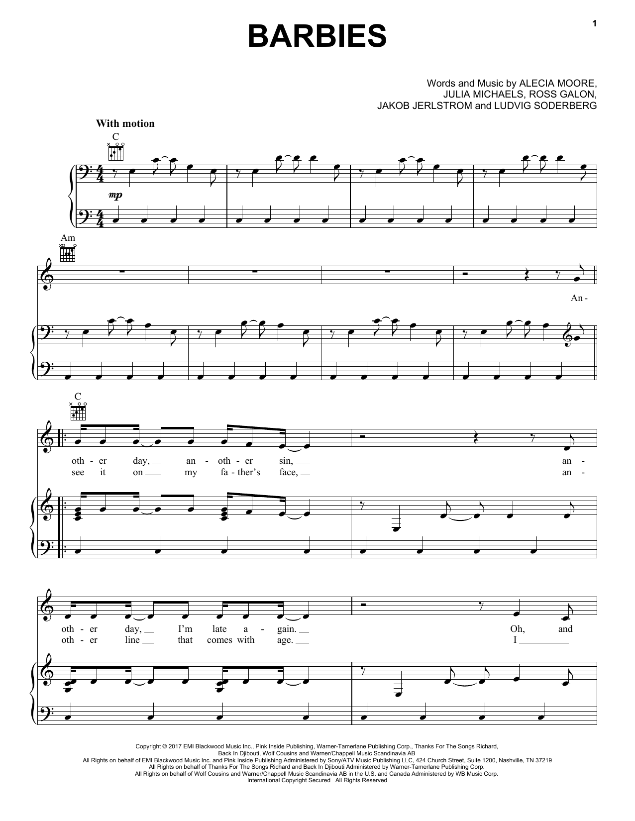 Download or print Pink Barbies sheet music, chords and digital score arranged for Piano, Vocal & Guitar Chords (Right-Hand Melody). This Pop score includes 8 page(s).