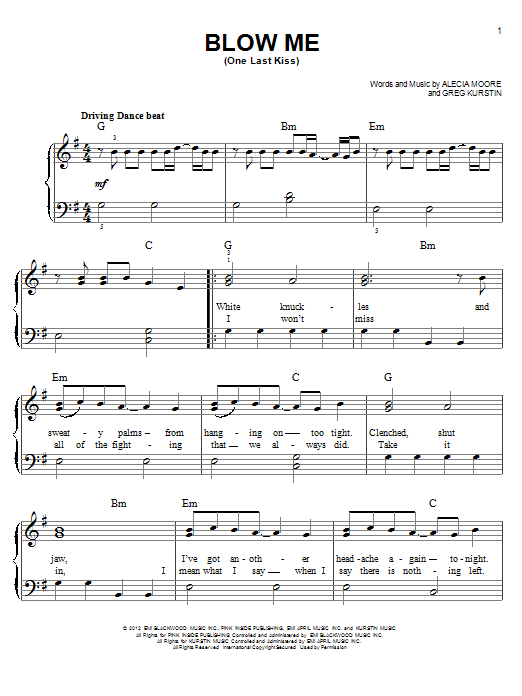 Download or print Pink Blow Me (One Last Kiss) sheet music, chords and digital score arranged for Piano, Vocal & Guitar Chords. This Pop score includes 6 page(s).