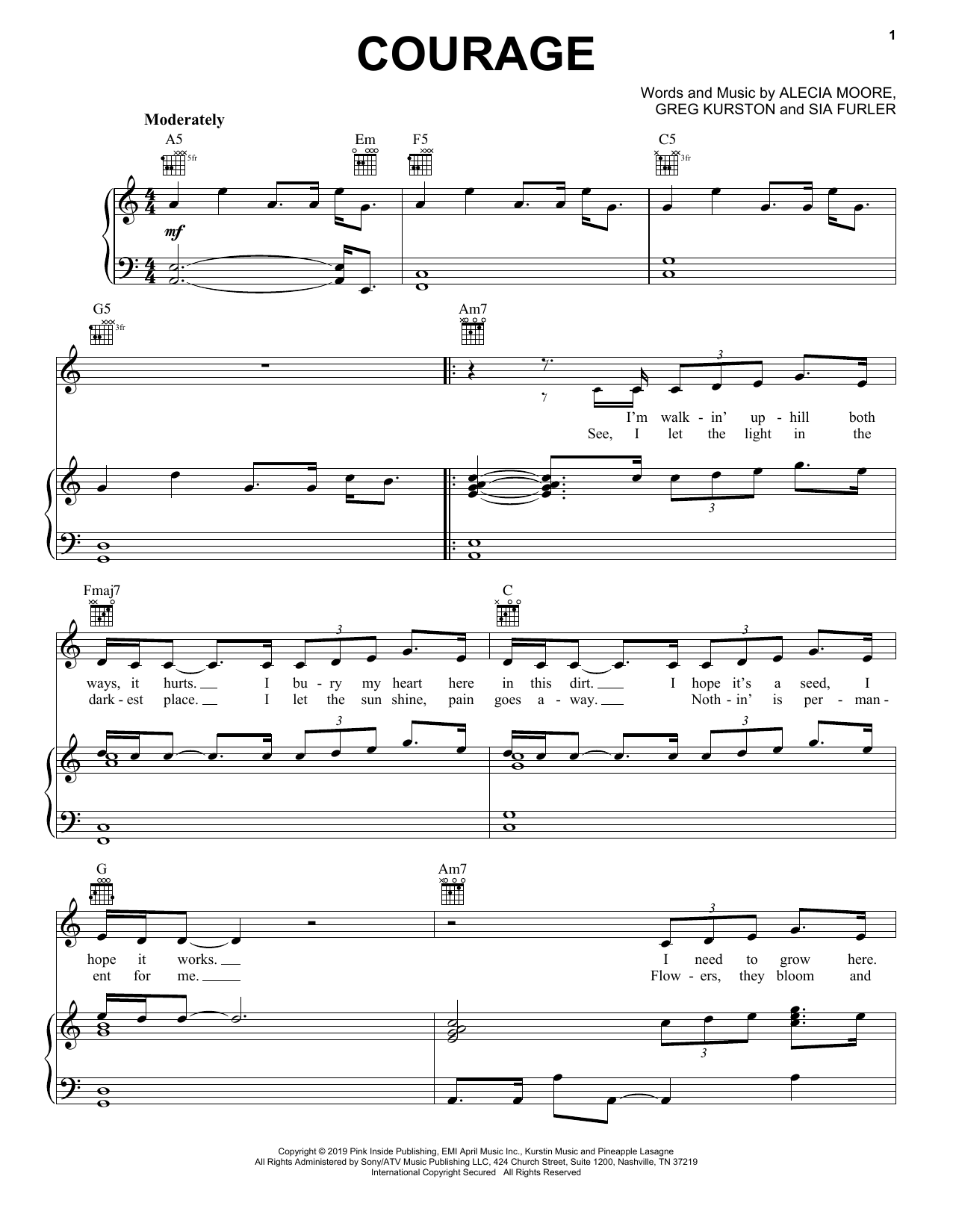 Download or print Pink Courage sheet music, chords and digital score arranged for Piano, Vocal & Guitar Chords (Right-Hand Melody). This Pop score includes 6 page(s).