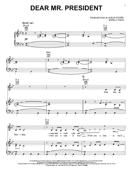 Download or print Pink Dear Mr. President sheet music, chords and digital score arranged for Piano, Vocal & Guitar Chords (Right-Hand Melody). This Country score includes 11 page(s).