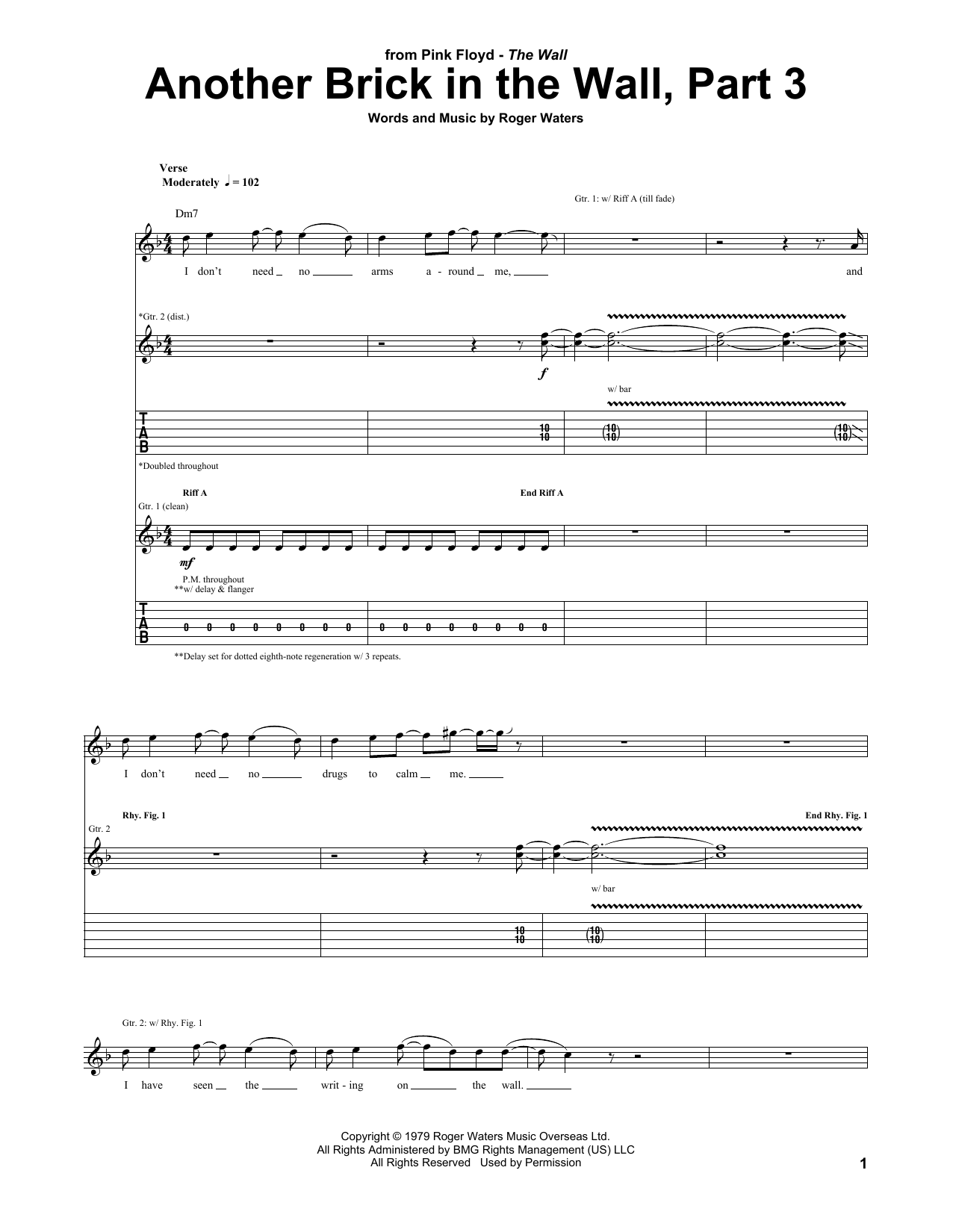 Download or print Pink Floyd Another Brick In The Wall, Part 3 sheet music, chords and digital score arranged for Guitar Tab. This Pop score includes 2 page(s).