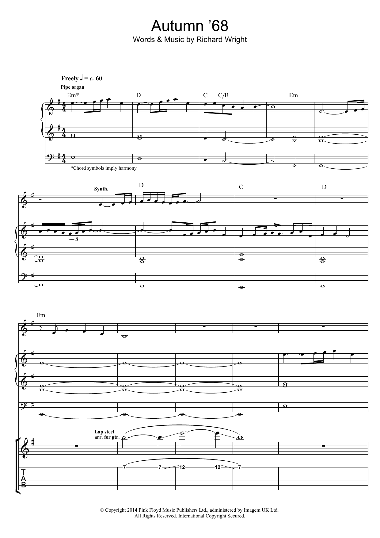 Download or print Pink Floyd Autumn '68 sheet music, chords and digital score arranged for Guitar Tab. This Rock score includes 2 page(s).