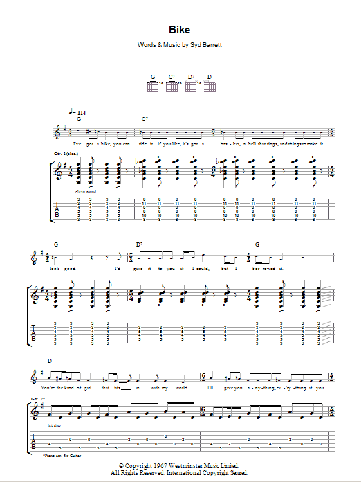 Download or print Pink Floyd Bike sheet music, chords and digital score arranged for Piano, Vocal & Guitar Chords (Right-Hand Melody). This Pop score includes 5 page(s).