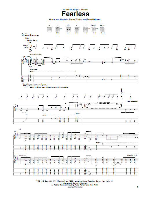 Download or print Pink Floyd Fearless sheet music, chords and digital score arranged for Piano, Vocal & Guitar Chords (Right-Hand Melody). This Rock score includes 3 page(s).