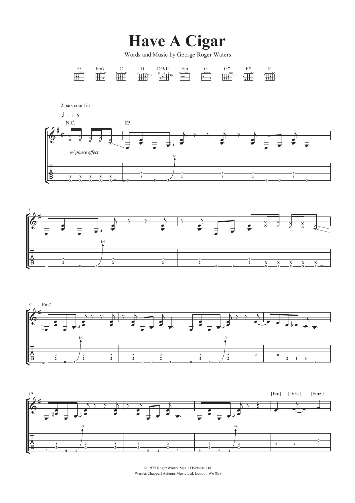 Download or print Pink Floyd Have A Cigar sheet music, chords and digital score arranged for Guitar Tab. This Rock score includes 9 page(s).