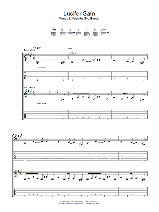 Download or print Pink Floyd Lucifer Sam sheet music, chords and digital score arranged for Guitar Tab. This Pop score includes 4 page(s).