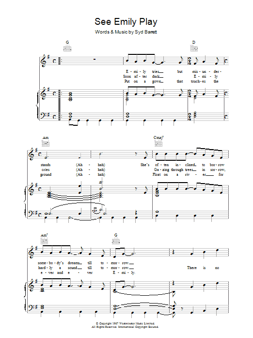 Download or print Pink Floyd See Emily Play sheet music, chords and digital score arranged for Guitar Chords/Lyrics. This Rock score includes 2 page(s).