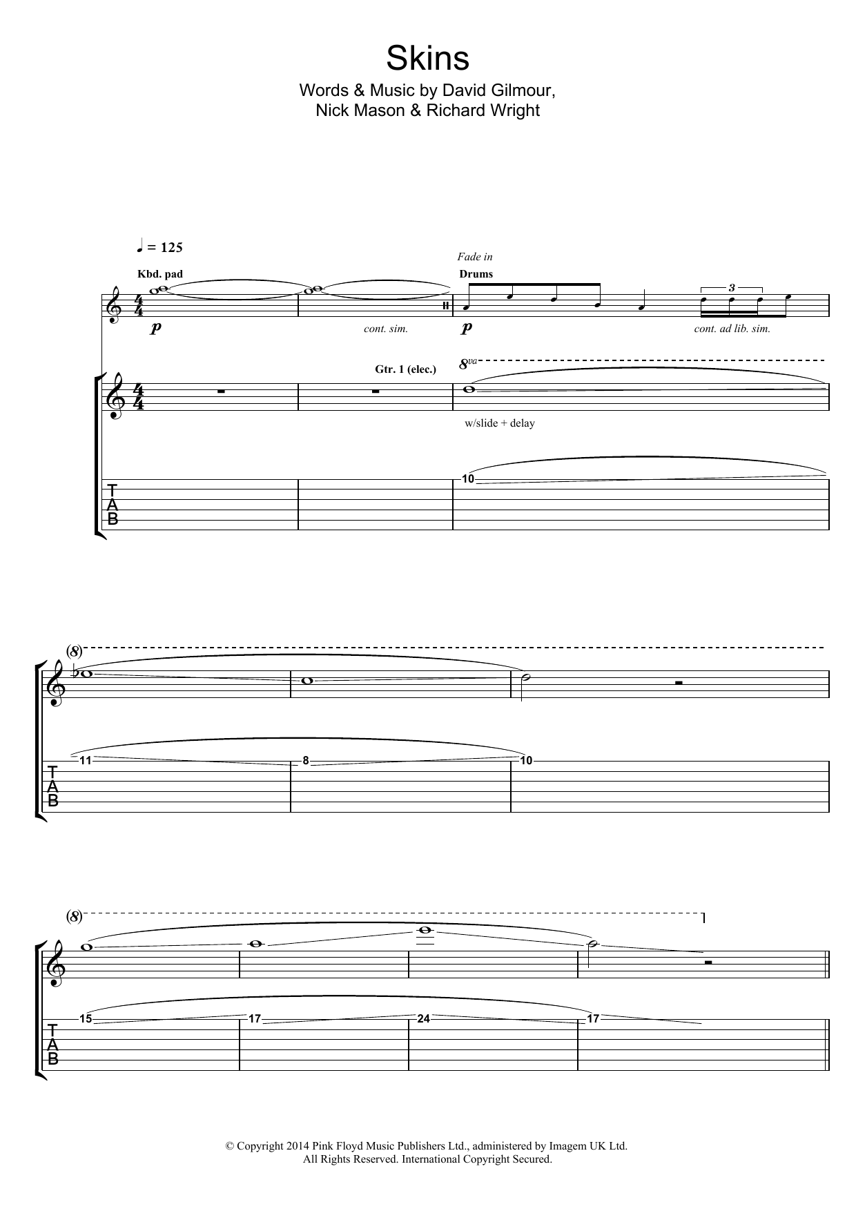 Download or print Pink Floyd Skins sheet music, chords and digital score arranged for Guitar Tab. This Pop score includes 1 page(s).