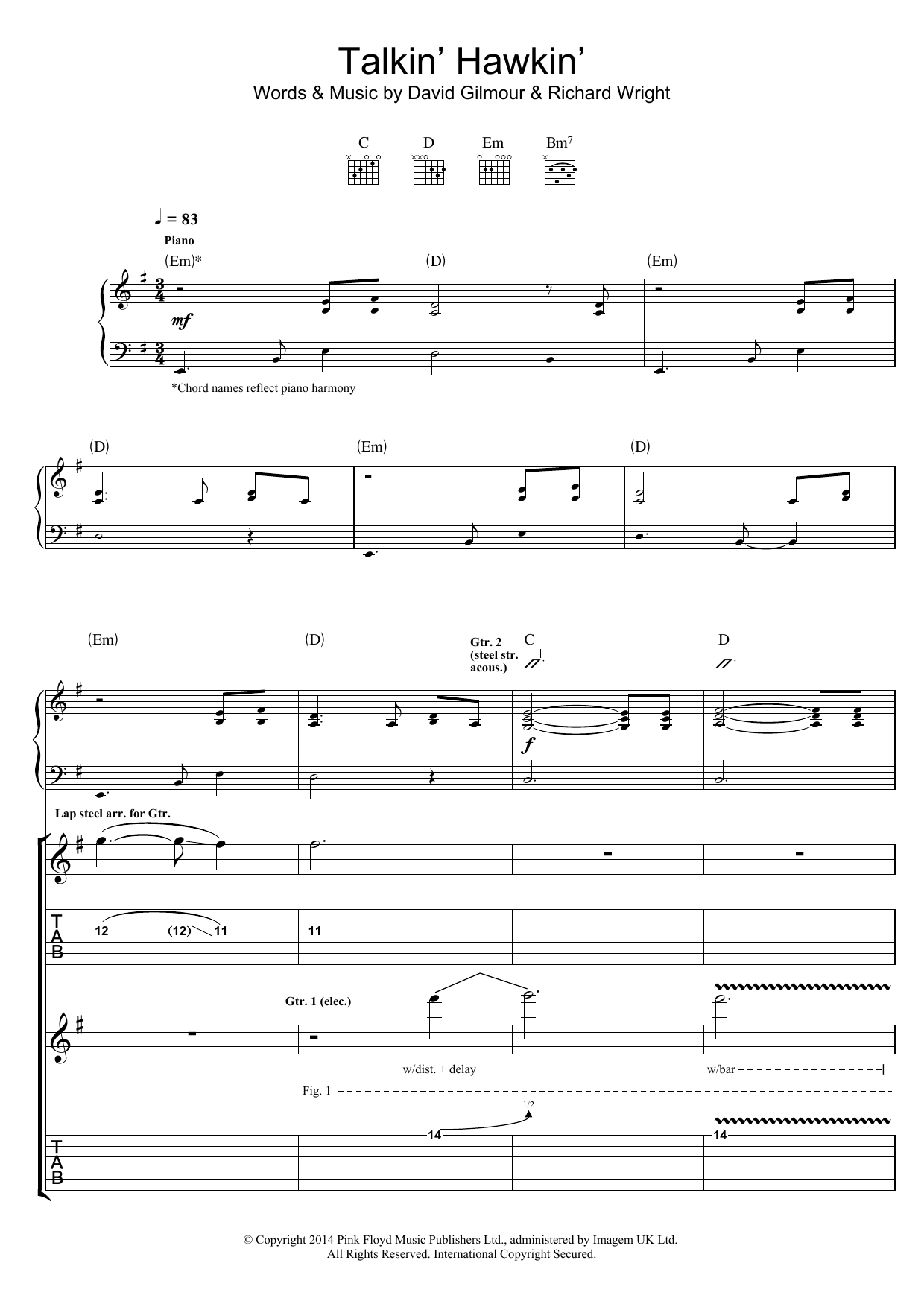 Download or print Pink Floyd Talkin' Hawkin' sheet music, chords and digital score arranged for Guitar Tab. This Pop score includes 7 page(s).