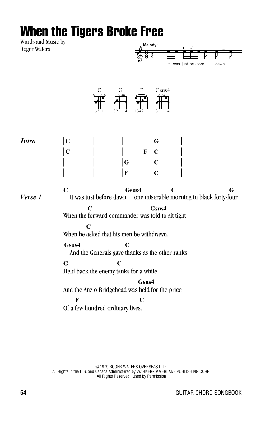 Download or print Pink Floyd When The Tigers Broke Free sheet music, chords and digital score arranged for Guitar Chords/Lyrics. This Pop score includes 2 page(s).