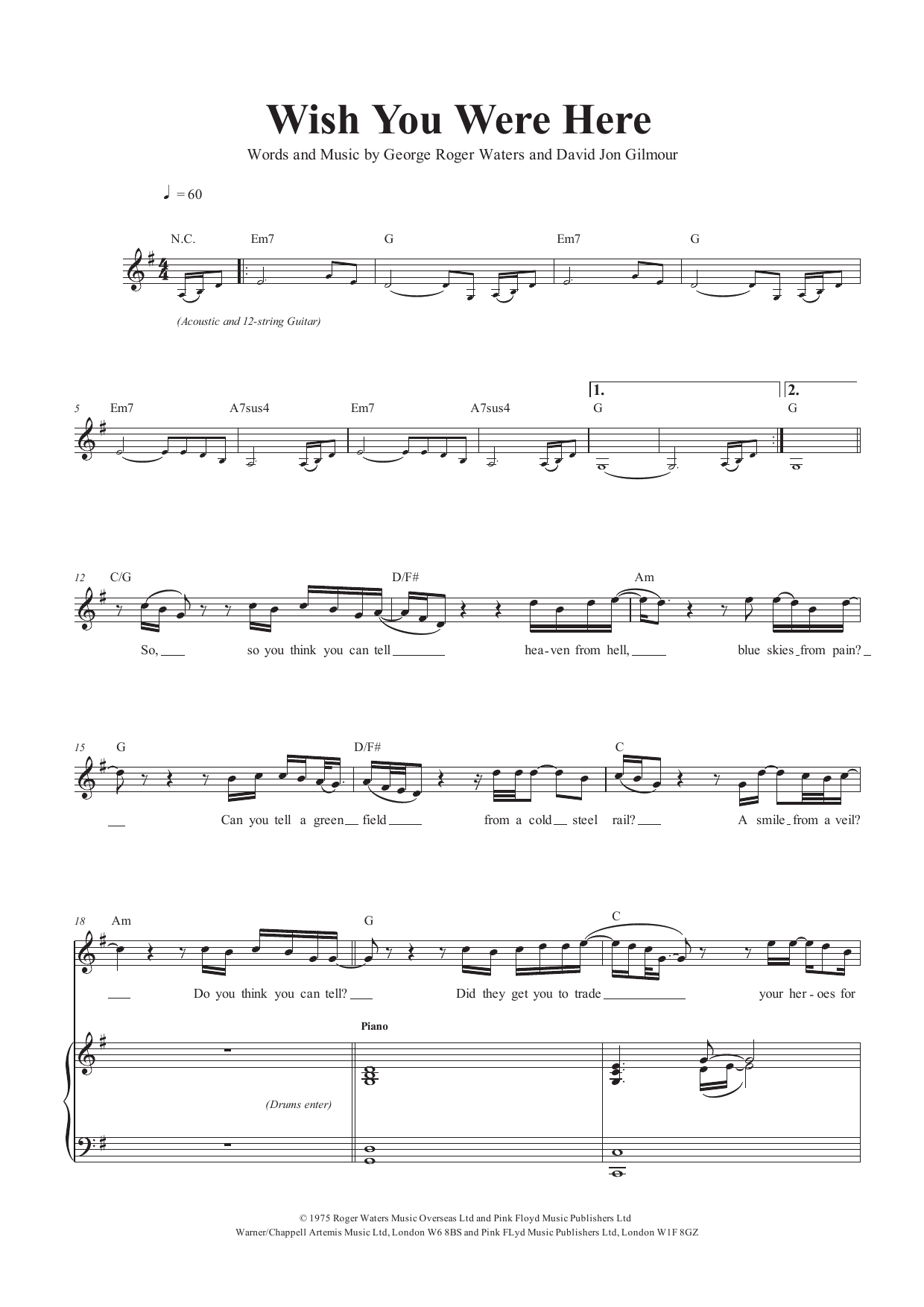 Download or print Pink Floyd Wish You Were Here sheet music, chords and digital score arranged for Drums. This Rock score includes 3 page(s).