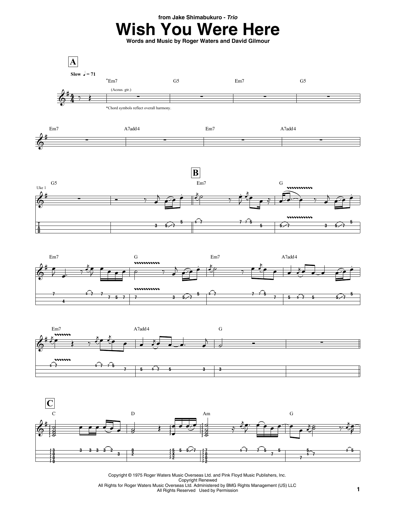 Download or print Pink Floyd Wish You Were Here (arr. Jake Shimabukuro Trio) sheet music, chords and digital score arranged for Ukulele Tab. This Rock score includes 4 page(s).
