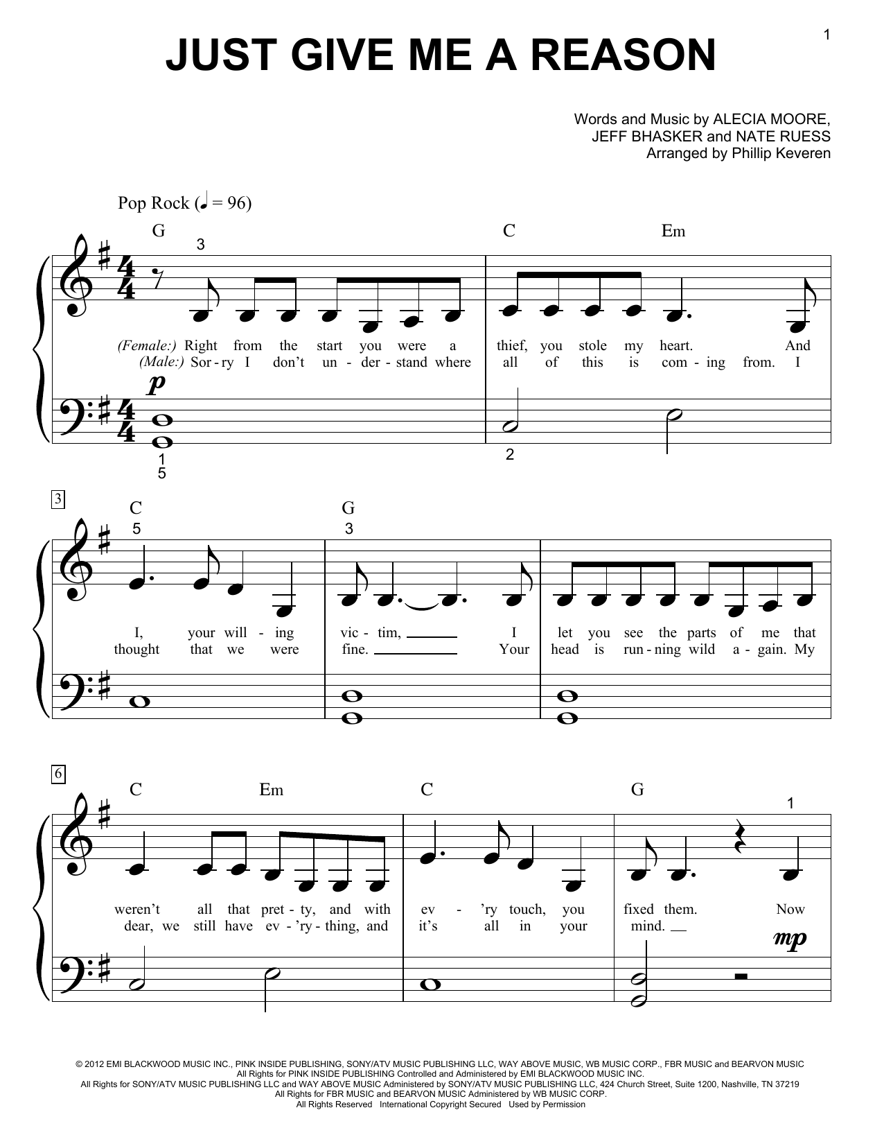 Download or print Pink featuring Nate Ruess Just Give Me A Reason (arr. Phillip Keveren) sheet music, chords and digital score arranged for Big Note Piano. This Jazz score includes 3 page(s).