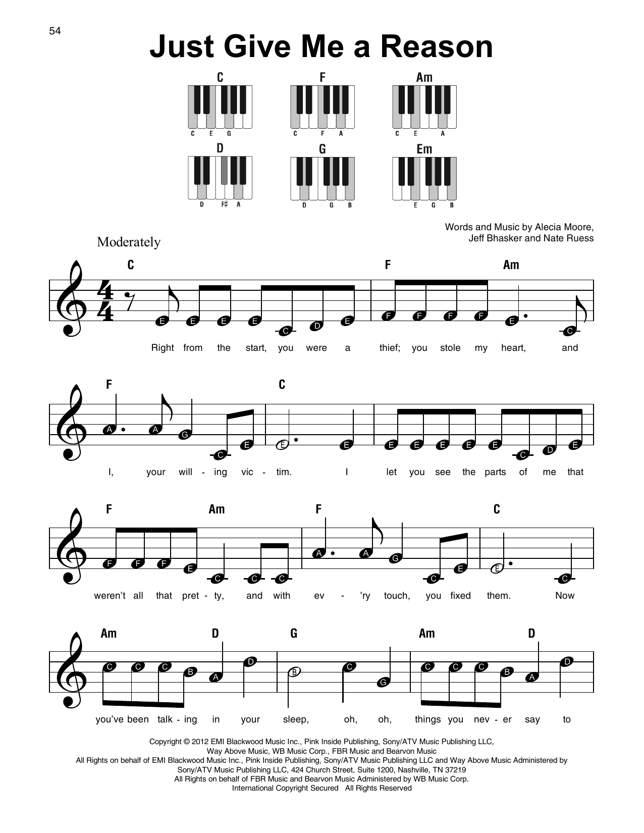 Download or print Pink Just Give Me A Reason (feat. Nate Ruess) sheet music, chords and digital score arranged for Piano, Vocal & Guitar Chords (Right-Hand Melody). This Pop score includes 8 page(s).