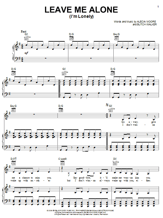 Download or print Pink Leave Me Alone (I'm Lonely) sheet music, chords and digital score arranged for Piano, Vocal & Guitar Chords (Right-Hand Melody). This Pop score includes 8 page(s).