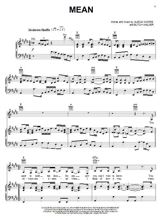 Download or print Pink Mean sheet music, chords and digital score arranged for Piano, Vocal & Guitar Chords (Right-Hand Melody). This Pop score includes 6 page(s).