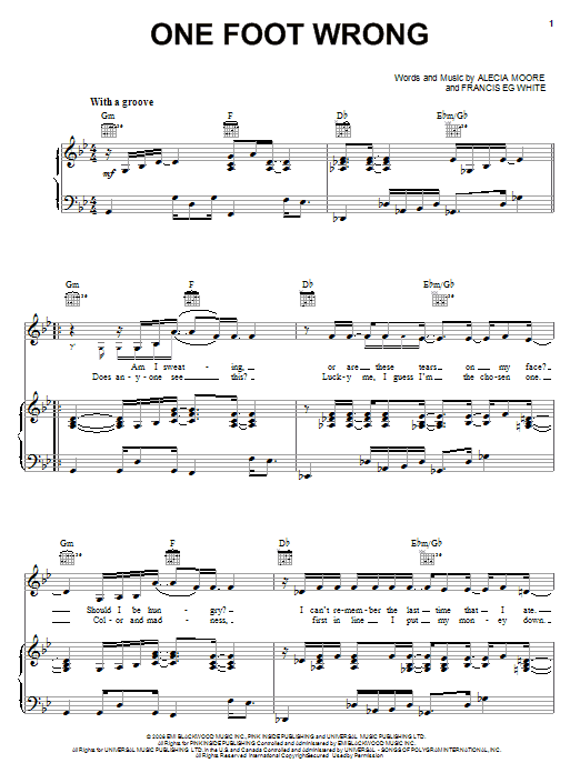 Download or print Pink One Foot Wrong sheet music, chords and digital score arranged for Piano, Vocal & Guitar Chords (Right-Hand Melody). This Pop score includes 5 page(s).